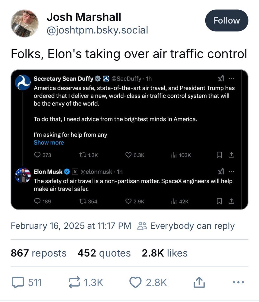 Musk is already taking advantage of the FAA’s unsettled conditions. On February 14, hundreds of FAA employees were fired. On February 16, he posted on social media that SpaceX would step in to address concerns about the recent spate of air accidents. By February 19, Wired reported that SpaceX engineers had been installed in jobs at the FAA.