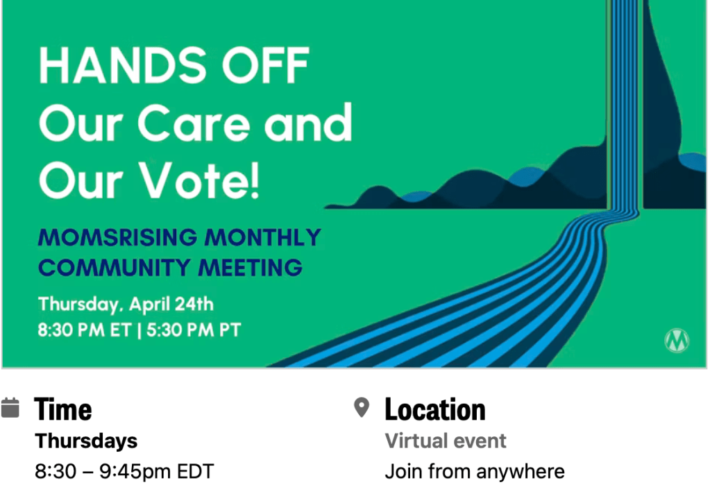 MEETING: MomsRising has Monthly Community Meetings on Protecting Our Communities: How Allies and Immigrants Can Take Action. Thursday May 22, 8:30-9:45 pm EST