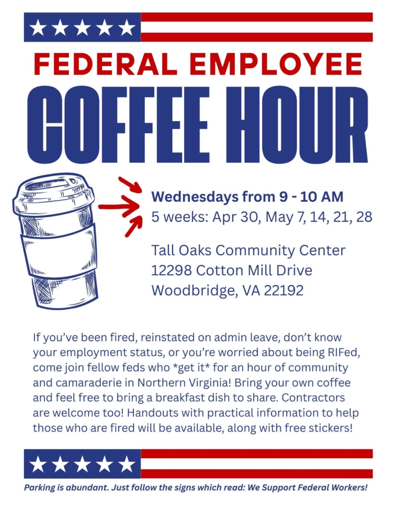 EVENT: Federal Employee Coffee Hour, Wednesday Apr 30 from 9-10 am, Tall Oaks Community Center, 12298 Cotton Mill Drive, Woodbridge, VA 22192. If you’ve been fired, reinstated on admin leave, don’t know your employment status, or you’re worried about being RIFed, come join fellow feds who *get it* for an hour of community and camaraderie in Northern Virginia! Bring your own coffee and feel free to bring a breakfast dish to share. Contractors are welcome too! Handouts with practical information to help those who are fired will be available, along with free stickers! Parking is abundant. Just follow the signs which read: We Support Federal Workers! Also on May 7, 14, 21, 28.