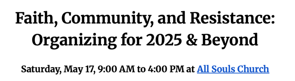 EVENT: Faith, Community, and Resistance: Organizing for 2025 and Beyond, Saturday May 17, 9 am to 4 pm, All Souls Church.