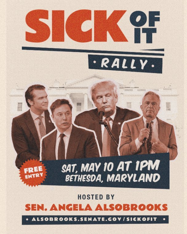 RALLY: Sick of It Rally Saturday May 10 at 1 pm, Bethesda, MD, hosted by Sen. Angela Alsobrooks. For more information, click here.
