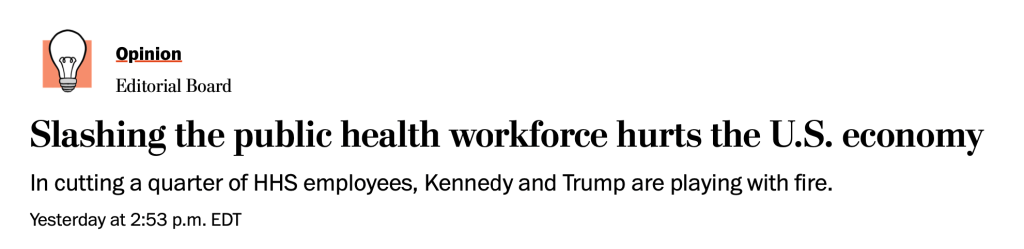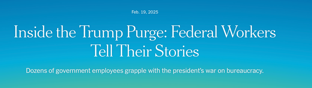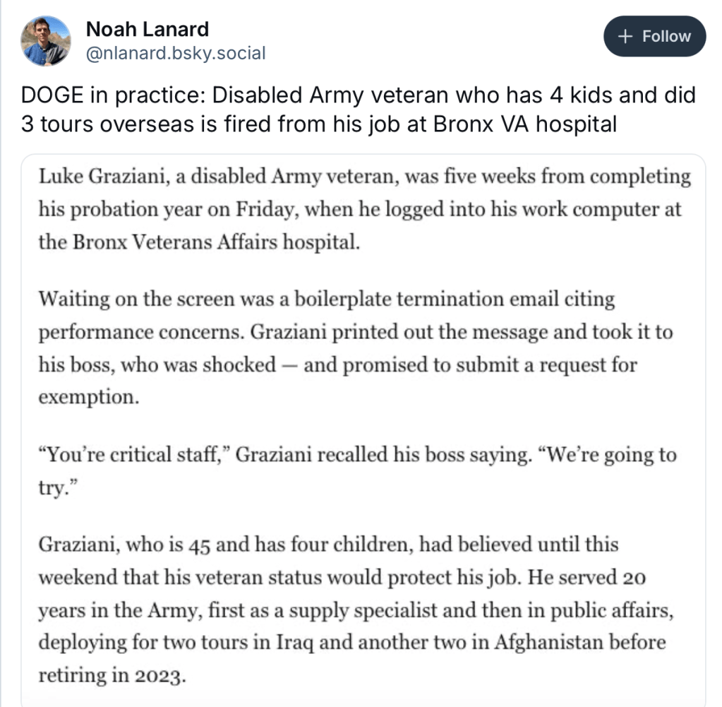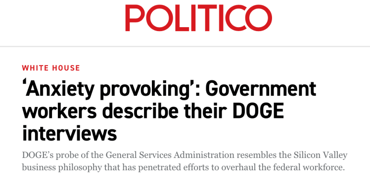 DOGE is conducting 15 min interviews of federal workers to decide who to fire. “GSA and DOGE’s vision for the agency now includes artificial intelligence projects that hint at “a Silicon Valley mental model of ‘pour all the data into a [large learning model] and then replace all the jobs with AI,” said the supervisor, who was familiar with the deliberations.” Click image to go to article.