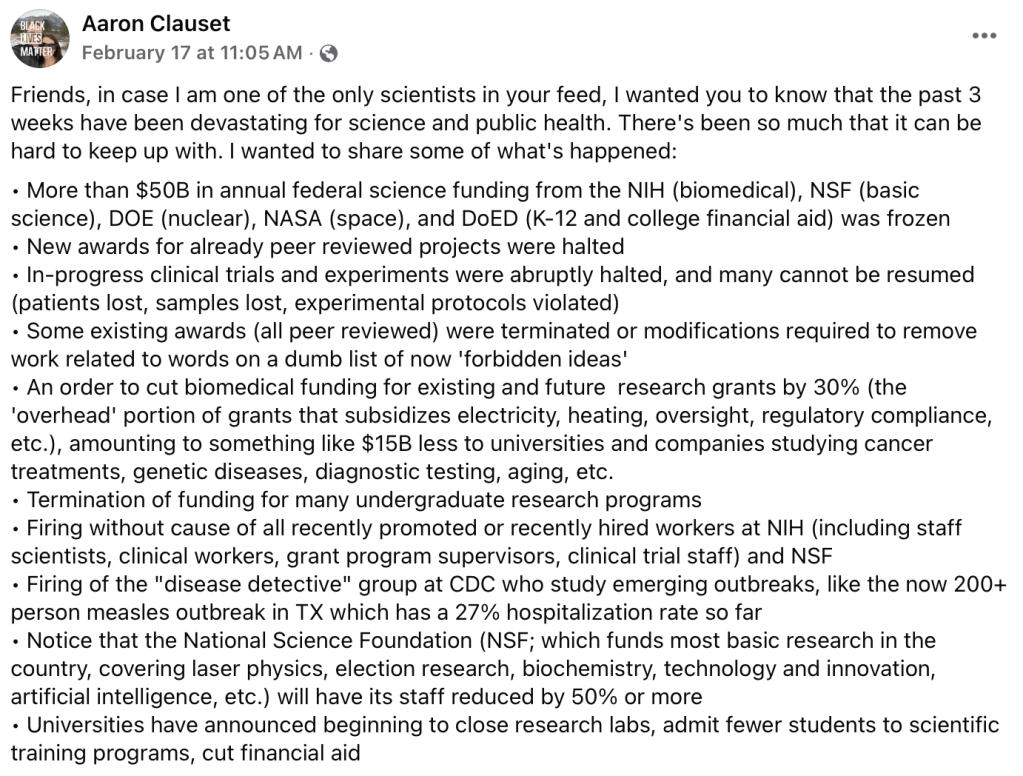 The Impact Project provides objective, transparent, and open-source data to help explain how federal policies, funding, and workforce changes affect our communities. Click image to go to website.Interactive map to see how your community will be affected by Trump/DOGE science & research cuts. Click image to go to website.A group of US researchers funded through federal grants who wish to document the damage to our scientific infrastructure. Our data archive is for use by journalists, academics, and the general public.Click image to go to website.Click image to go to blog post.fedsworkforyou Instgram account highlights the important work by federal workers. Click image to go to profile.